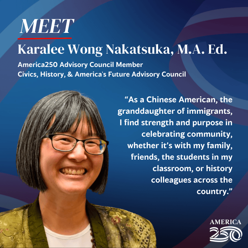 As a Chinese American, and the granddaughter of immigrants, I find strength and purpose in celebrating community, whether it’s with my family, friends, the students in my classroom, or history colleagues across the country. Participating in America’s 250th is an opportunity to celebrate the community of “We the People.” We Asian Americans, Native Hawaiians, and Pacific Islander Americans, and all communities, need to participate and speak up to remind ourselves and our fellow Americans that we are all an integral part of the story of America, past, present, and future.