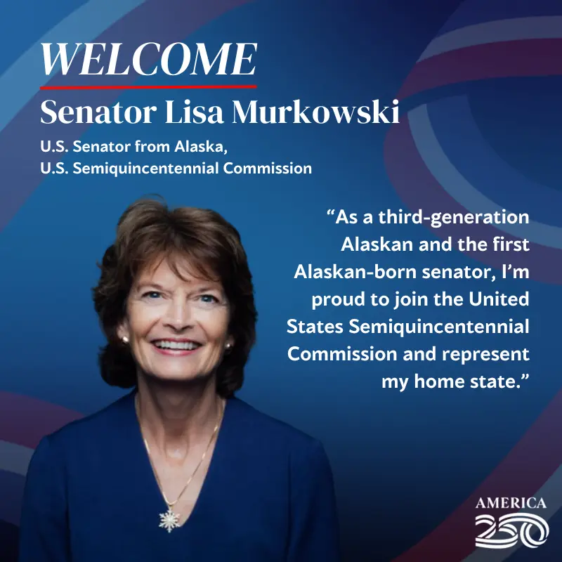 “As a third-generation Alaskan and the first Alaskan-born senator, I’m proud to join the United States Semiquincentennial Commission and represent my home state,” said Senator Lisa Murkowski. “Having served Alaskans and the American people for 25 years, I am well positioned to help strategize and contribute to the Commission’s goal of bringing the nation together for America’s 250th anniversary. I look forward to working with my fellow commissioners and all organizations involved to engage Americans in this historic milestone while ensuring the great state of Alaska’s voice is heard throughout these efforts.”
