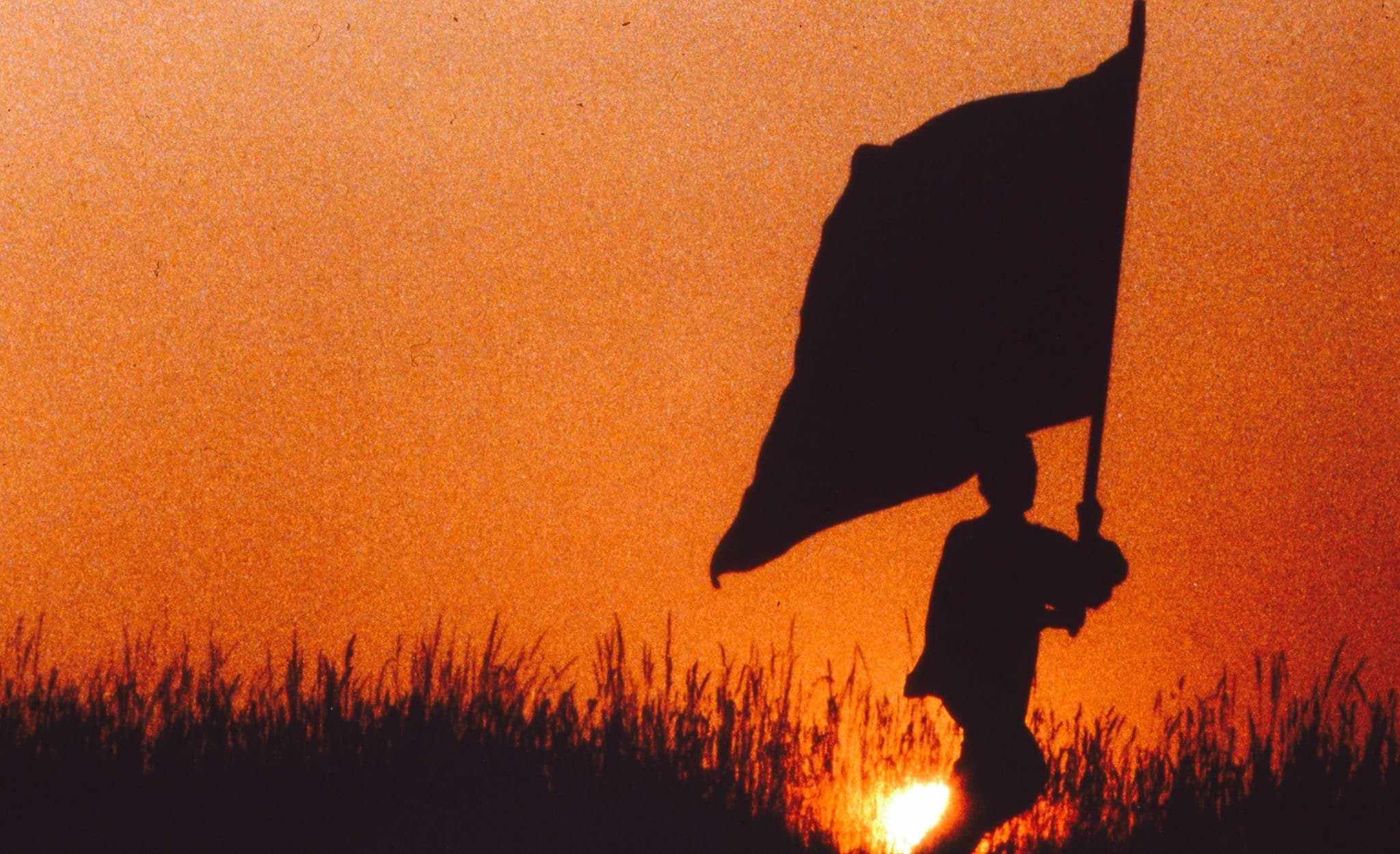 A silhouette of someone waving the American flag in a field during a sunrise.