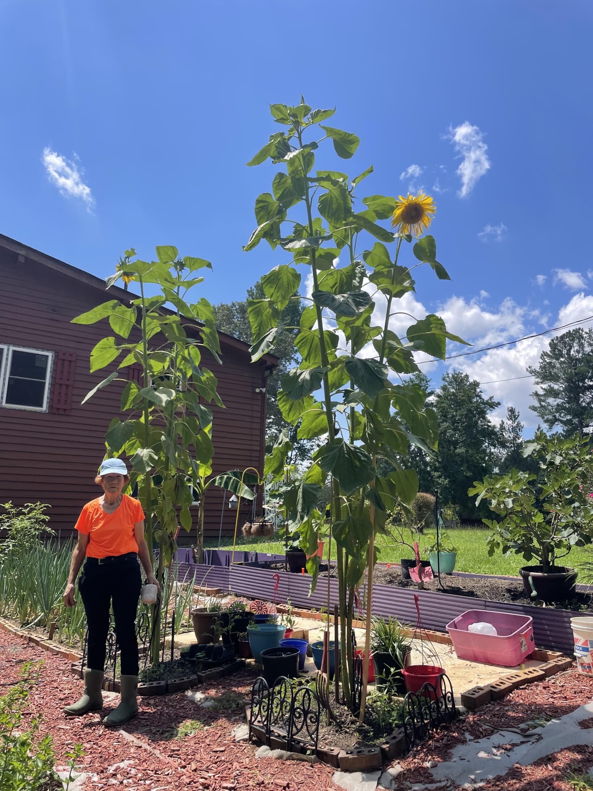 Viviana R.’s grandmother stands beside towering sunflower plants in their pandemic-born garden, a symbol of hope and family pride.