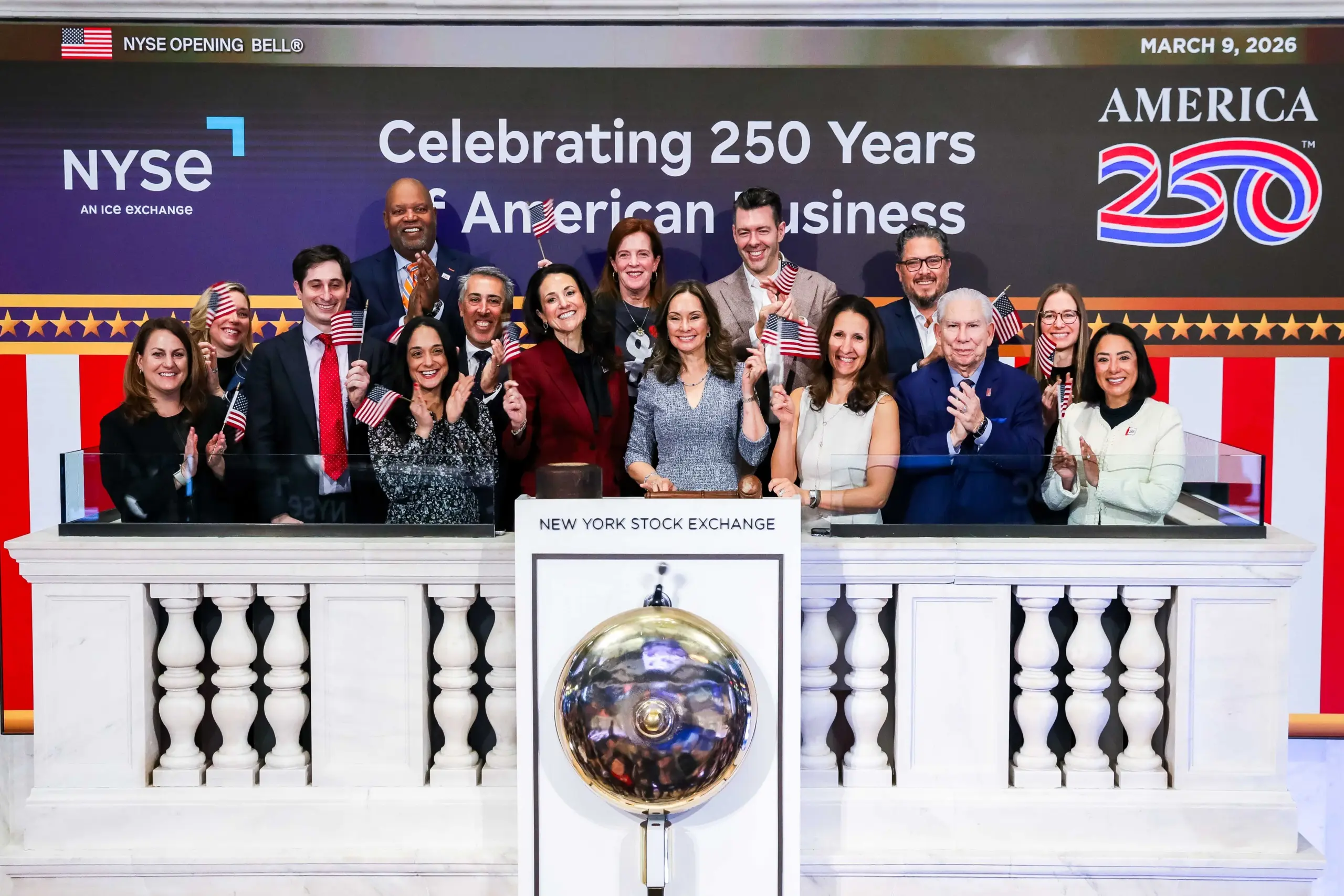Representatives of America250 rang the bell to open the New York Stock Exchange on Monday, March 9. NYSE is partnering with America250 on initiatives that elevate financial literacy, spotlight American companies and workers, and connect historical reflection with forward-looking conversations about economic opportunity
