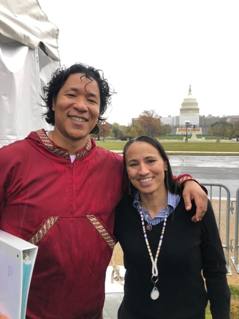 From right: U.S. Representative Sharice Davids (KS) and America250 Senior Manager of Tribal Partnerships Andrei Jacobs (left) stand in front of the Capital before the National Native American Veterans Memorial dedication ceremony on Friday, November 11th. Representative Davids was a featured speaker and was raised by a single mother, who served in the Army for 20 years.